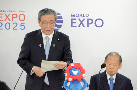 大阪・関西万博の成功を目指す超党派の議員連盟は10日、大阪市の万博会場で総会を開いた。会長を務める自民党の森山裕前幹事長(左)は「全ての企画が順調に進み、一つの哲学を持って成功に導かれてきた」と評価。 【時事通信社】