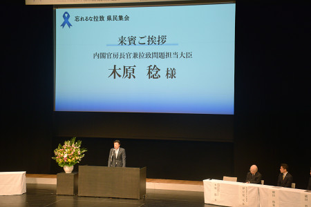 拉致問題の早期解決を求める集会で発言する木原稔官房長官(演壇)。「私が最後の拉致問題担当相になるべきだ」と決意を表明した=15日午後、新潟市 【時事通信社】
