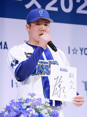DeNAは6日、横浜市内で新人6選手(育成1人を含む)の入団を発表した。写真は、あいさつするドラフト1位の小田康一郎内野手。 【時事通信社】