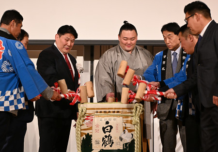 大相撲で元大関の朝乃山(中央)が3日、大阪市内で開かれた大阪後援会による激励会に出席した。春場所(8日初日)に向け、「先場所はふがいない成績だった。優勝を目指して頑張る」と力強くあいさつした。 【時事通信社】