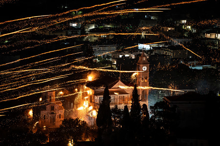 12日、ギリシャのヒオス島で、イースター(復活祭)を祝うため打ち上げられたロケット花火。二つの教会の信者が数千発の手作り花火を発射し、反対側にある教会の鐘楼を狙う。 【EPA時事】
