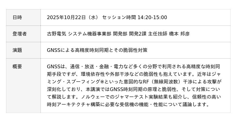 古野電気株式会社(本社:兵庫県西宮市、代表取締役社長執行役員:古野幸男、以下 当社)は、2025年10月22日(水)にIIJグループ本社(東京都千代田区)で開催されるGNSS時刻同期技術セミナー「GNSS TimeSync 2025」に共催企業として参加します。