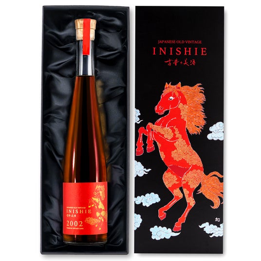 新商品『INISHIE 2002 干支シリーズ「午」』は、2026年の新年を華やかに迎える“お祝いのための一本”として誕生しました。24年前の午年(2002年)に仕込まれ、長い時をかけて静かに熟成された、極めて希少なから熟成した日本酒の古酒です。2026年の新年を華やかに迎える、お祝いのための逸品です。