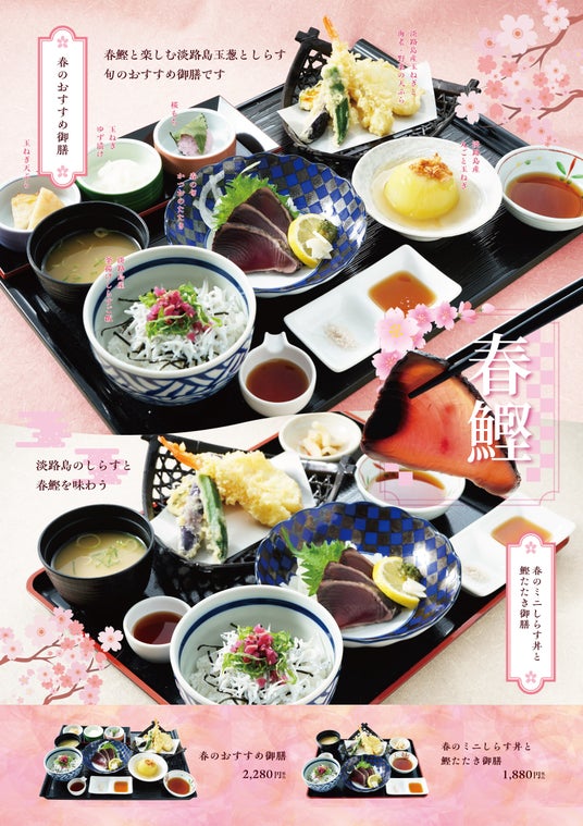 春のミニしらす丼と鰹たたき御膳 1880円春限定メニュー「春のミニしらす丼と鰹たたき御膳」を発売いたします。 淡路島産しらすをたっぷり使用したミニしらす丼は、ふんわりとした食感と上品な旨みが魅力。 香ばしく炙った鰹のたたきと組み合わせることで、春らしい爽やかさと海の恵みを一度に楽しめる御膳に仕上げました。