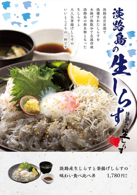 淡路産生しらすと釜揚げしらすの味わい食べ比べ丼 1,780円淡路島岩屋漁港で漁獲されたしらすを水揚げ後数分で急速冷凍。淡路島の新名物となった「生しらす」と大人気「釜揚げしらす」のいいとこどりの一杯です。
