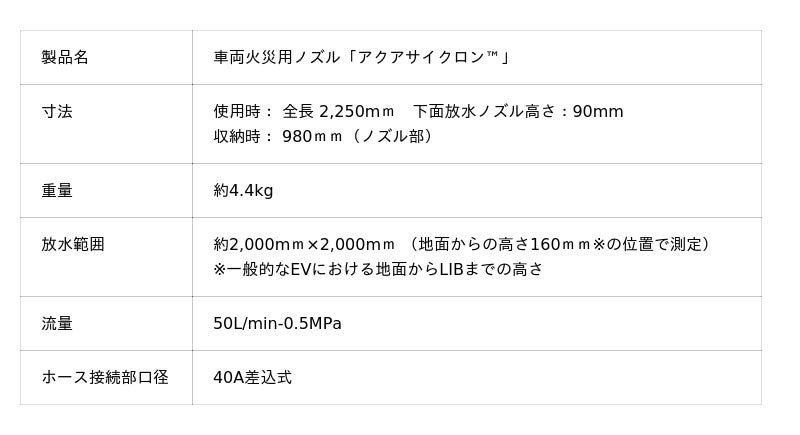 ・全高90mmの薄型設計により、車両下部からLIBを効果的に冷却します。また、先端のノズルが回転することで、50L/minと低流量で広範囲に放水でき、熱暴走や再燃のリスクを低減します。