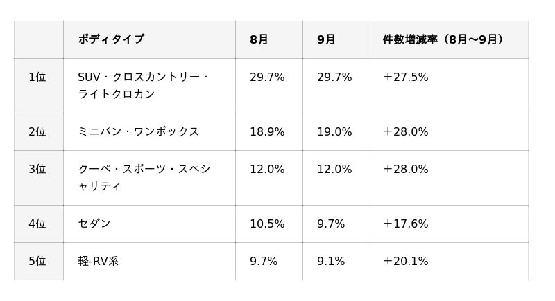 一方で、ランキング圏外ですが、軽キャブバンやハードトップはやや減少傾向にあり、市場の中心が実用車やSUVに移行しています。