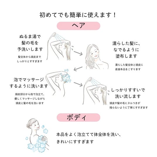 初めてでも簡単にお使いいただけます(ヘア)濡らした髪全体と頭皮に直接本品をこすり泡立て、 指先で優しくマッサージをした後、きれいにすすぎます。