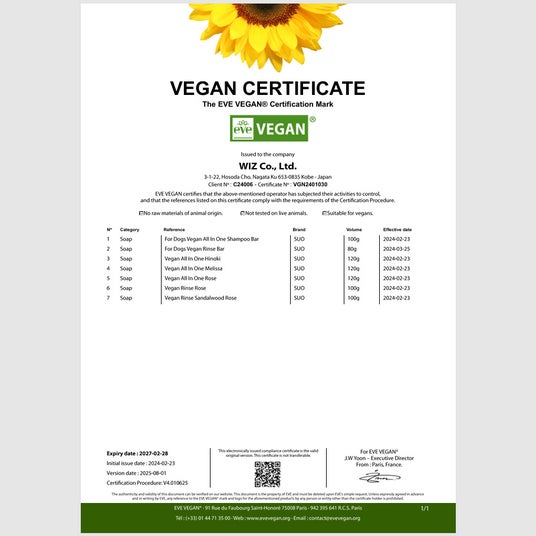 EVE VEGANとは、フランスの「イブ(EVE; Expertise Vegane Europe)社」が発行するビーガン国際認証マーク。動物の権利と環境、倫理的消費、製造過程での倫理性を大事にし、生物由来原料、動物実験原料、動物由来物質を排除した化粧品を対象としている。また、パラベン・硫酸塩・ナノ物質 などの有害成分と発がん性・変異・複製生成物が含まれていないかを審査。製造施設の清潔さと交差汚染、混入防止のための生産設備があるのかも審査基準に含まれる。