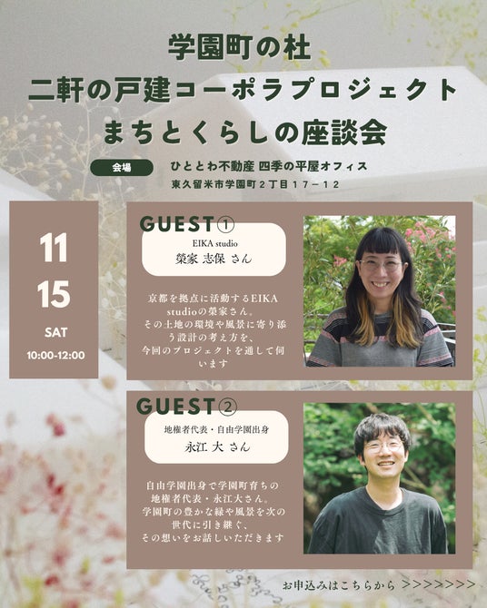 最後に本プロジェクトに関連するまちあるきイベントおよび、ご興味のある方に向けた東久留米市学園町での暮らしの様子をお伝えするイベントのご案内をいたします。