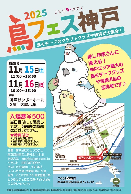 「小鳥たちを眺めながら、まったりコーヒータイム♪」をコンセプトにした「ことりカフェ上野本店」(http://kotoricafe.jp/)を運営する株式会社ことりカフェ(本社:東京都台東区 代表取締役 川部志穂)は、11月15日(土)・11月16(日)に「神戸サンボーホール」貿易センター駅より徒歩1分(https://kobe-sanbo.net/)にて、“鳥好きによる鳥好きのためのフェスタ”「鳥フェス神戸」(主催:ことりカフェ)を開催いたします。