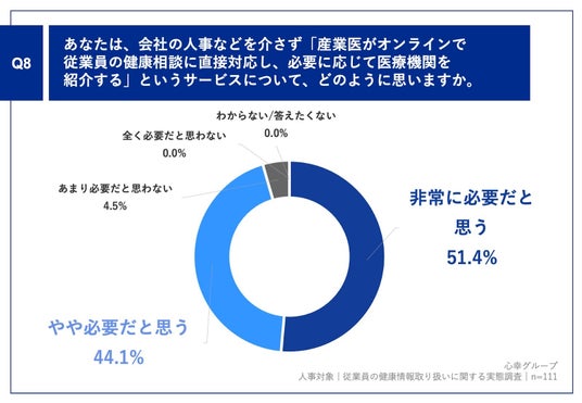 人事担当者の95.5%が、産業医がオンラインで従業員に直接対応する仕組みを「必要」と回答しています※6。今後は、制度説明から予約、相談、受診・服薬までを一体で設計し、実際に使われる導線を構築できる企業が増えていくと当社は見ています。