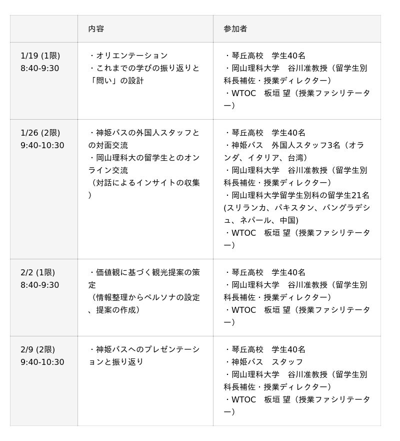 姫路市立琴丘高等学校 国際文化科(所在地:姫路市今宿668番地、代表者:校長 間嶋 孝史)と岡山理科大学(所在地:岡山市北区理大町1-1、代表者:学長 平野 博之)、株式会社WTOC(所在地:東京都渋谷区、代表取締役:堂原有美)は、この度、神姫バス株式会社(所在地:兵庫県姫路市北条口1丁目17番地、代表取締役社長:長尾 真)と連携し、「一般論としての外国人」ではなく「目の前の○○さん」という具体的な個人に向き合い、その心の動きから、新たな観光価値を創造する国際探究学習プロジェクトを実施します。