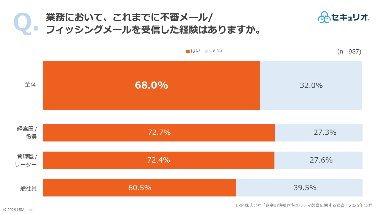 調査の結果、経営層(役員クラス以上)のセキュリティインシデント経験率が一般社員を大きく上回る実態や、セキュリティ教育が実際の行動変容に結びついていない実態が明らかになりました。