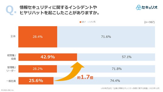 - 経営層のセキュリティインシデント/ヒヤリハット経験率は42.9%に達し、一般社員(25.6%)の約1.7倍に。