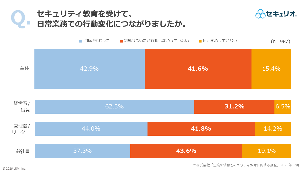- セキュリティ教育受講者の57.0%が「行動は変わっていない」と回答。