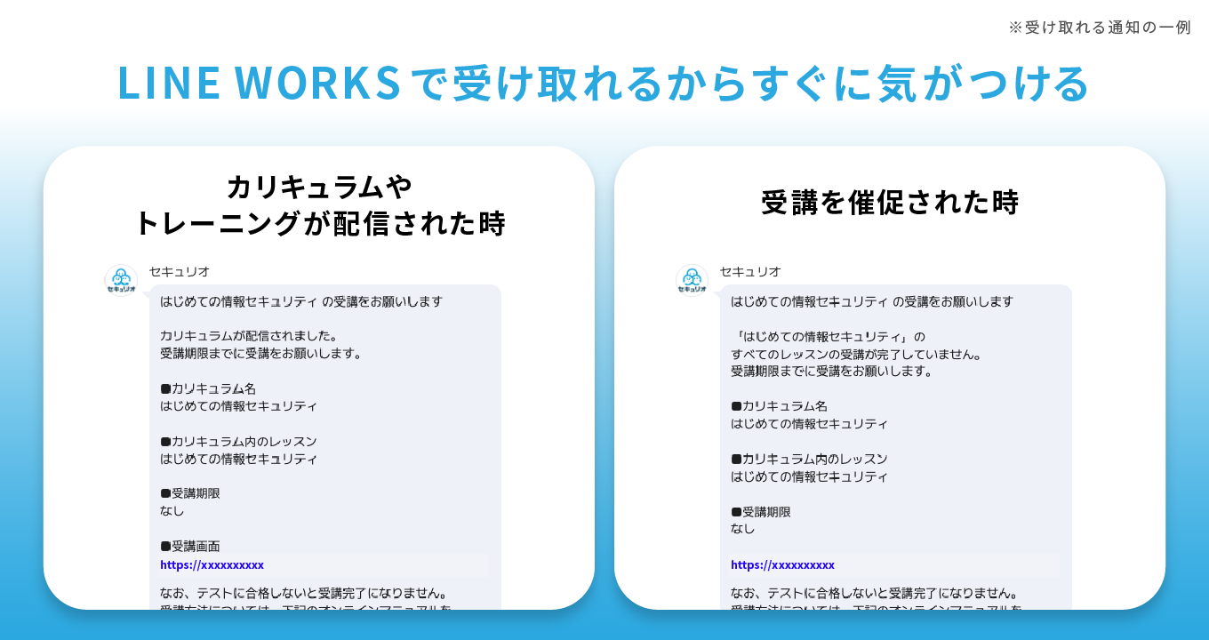 本連携により、セキュリオからの各種通知をLINE WORKS上で直接受け取ることが可能となり、従業員の受講体験の向上と、管理者の運用工数削減を同時に実現します。