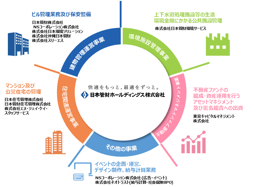 事業内容:オフィスビル、集合住宅、環境施設等の管理運営事業や不動産ファンドマネジメント事業等を営むグループ会社の経営管理及びこれに附帯又は関連する業務