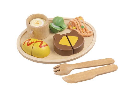 『森のランチプレート』は、こどもたちの「やってみたい」をそのまま形にした、木製のままごとセットです。プレートいっぱいに並んだお子様ランチは、見た瞬間に「これがやりたかった!」と感じるようなワクワク感を引き出します。テーブルに並べて「いらっしゃいませ!」とお店屋さんになりきったり、「どれから食べますか?」とやりとりをしたり。遊び始めたその瞬間から、こども自身が“役割”を持ち、ストーリーをつくり始めます。