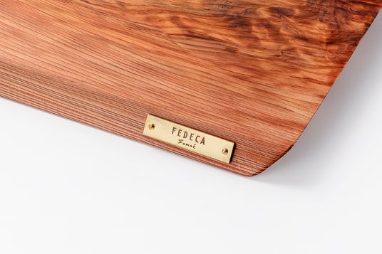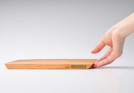 毎日使う道具だからこそ、端面には絶妙な傾斜を施し、指がスッと入って軽やかに持ち上げられる「機能美」にもこだわりました。有機的な木のラインを引き締める「真鍮製のブランドプレート」が、キッチンや食卓に凛としたアクセントを加えます。