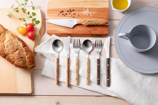 新潟県燕三条の老舗・佐藤金属工業(SALUS)が手がける、かつての航空機内で採用されていたカトラリーをベースに共同開発。限られた機内でも安全で使いやすいよう計算された小ぶりで愛らしいデザインに、Somaeならではの木の温もりと真鍮のアクセントを重ねました。